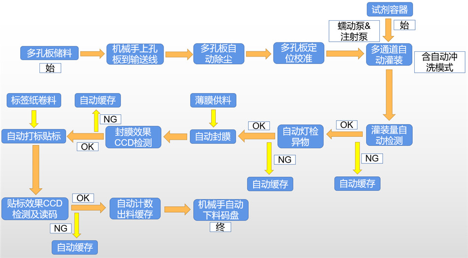 本產(chǎn)線可實現(xiàn)多孔板周轉(zhuǎn)車儲料—>自動供料—>自動吸塵—>自動定位—>自動灌裝—>自動燈檢異物—>自動檢測灌裝量—>自動注硅油—>自動封膜—>封膜效果CCD檢測—>自動打標(biāo)貼標(biāo)—>CCD讀碼及貼標(biāo)效果檢測—>自動計數(shù)出料緩存—>自動碼盤裝箱及各工位不良品剔除緩存等一系列動作,使該類產(chǎn)品的灌裝封膜貼標(biāo)工序?qū)崿F(xiàn)完全自動化,提升產(chǎn)能及品質(zhì),節(jié)省人工。